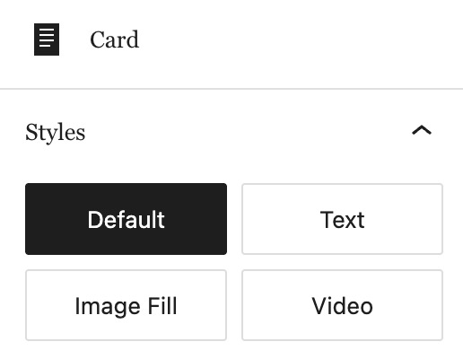 The card block has 4 pre-configured styles: Default, Text, Image Fill and Video.