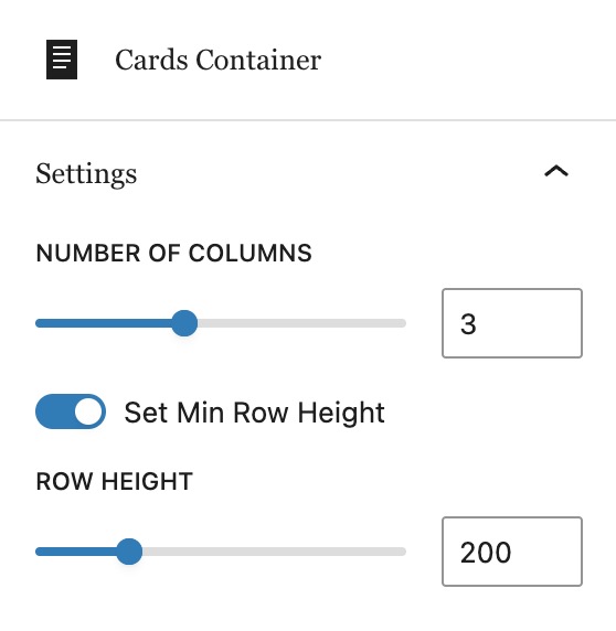 The primary block for laying out content is the Card Container. This block creates a grid into which Cards are added. There is not much to configure on the actual Cards Container block besides the number of columns. The row height can also be adjusted, but generally the default should work in most cases.